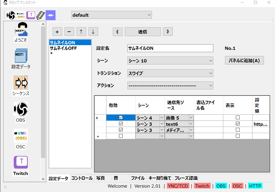- 運用モード時は、ボタンを押すと実際にOBSに設定が送信されます